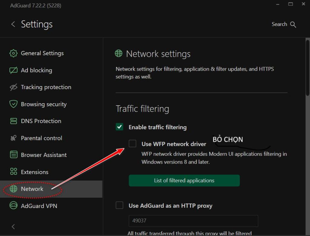 • Bạn không cần gỡ Adguard, chỉ cần tắt WFP network driver.