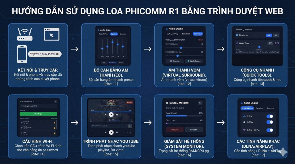 Loa thông minh Phicomm R1 (thường được biết đến với các bản firmware tùy chỉnh như Infinity) là một thiết bị sở hữu phần cứng âm thanh ấn tượng từ Harman Kardon. Tuy nhiên, để khai thác hết tiềm năng của nó, đặc biệt là các tính năng nghe nhạc online (YouTube) và tinh chỉnh âm thanh sâu hơn, bạn cần kết nối nó với Wi-Fi và sử dụng giao diện điều khiển trên nền web.
