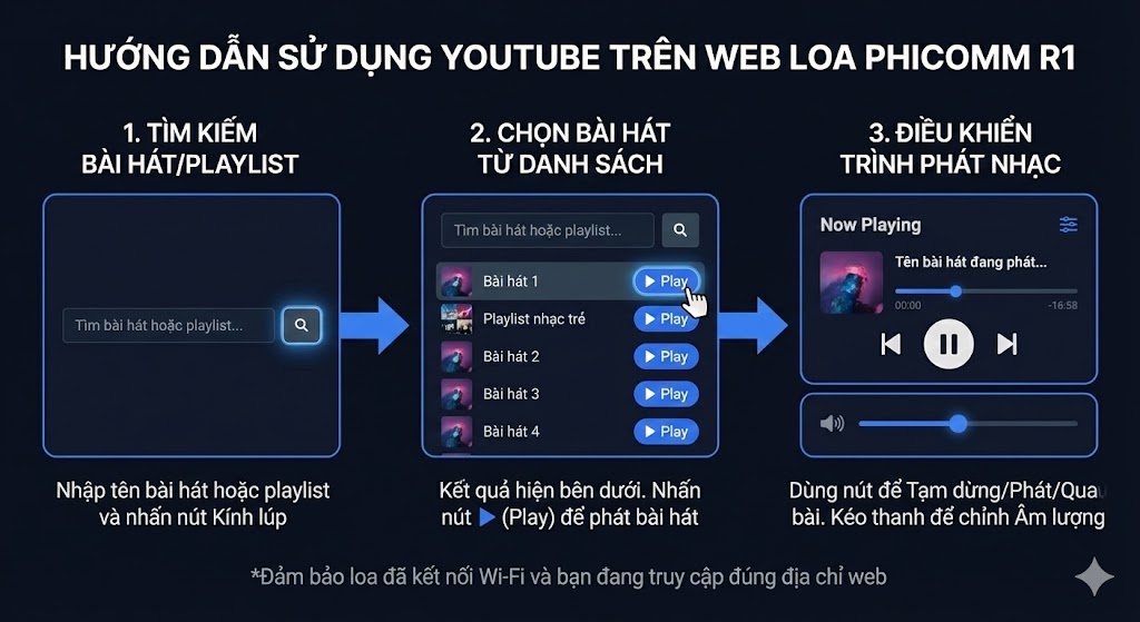 Cùng mạng Wi-Fi: Thiết bị điều khiển (điện thoại/PC) bắt buộc phải kết nối cùng một mạng Wi-Fi với loa.