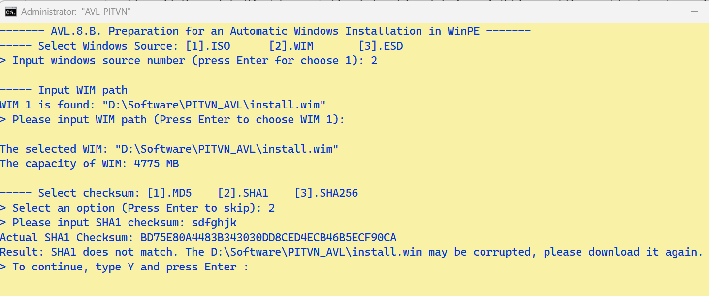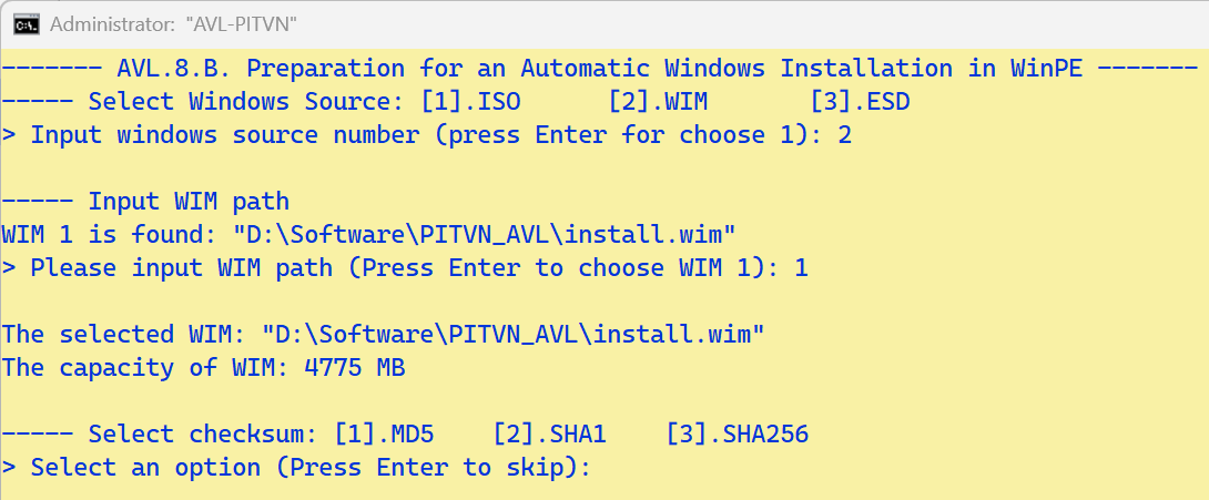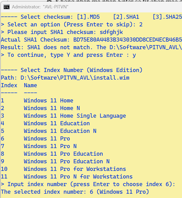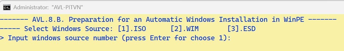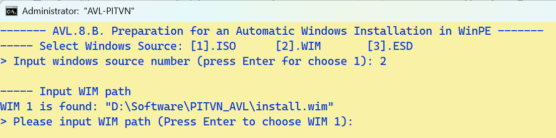 - Ứng dụng tự liệt kê tập WIM nằm cạnh AVL.cmd. Người dùng không nhập gì mà chỉ nhấn Enter để được chọn mặc định trong ngoặc đơn)