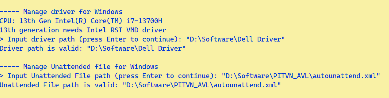 - Input Unattended file path: nhập đường dẫn chứa tập tin trả lời tự động xml. Không nhập gì mà chỉ nhấn Enter để bỏ qua việc nhập.