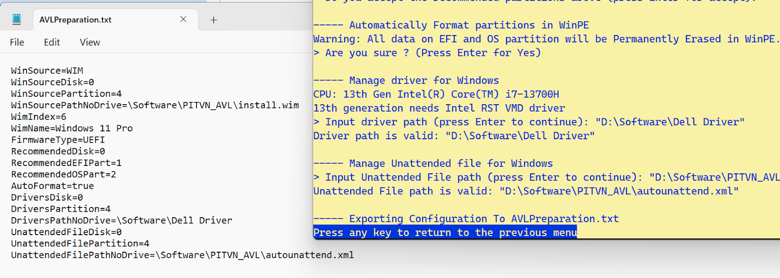 - Ứng dụng tự sao chép tập tin AVLPreparation.txt (nếu có) nằm cạnh AVL.cmd vào cạnh bên tập tin wim đã nhập.