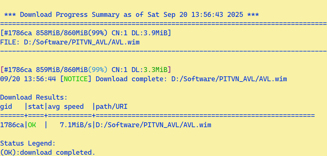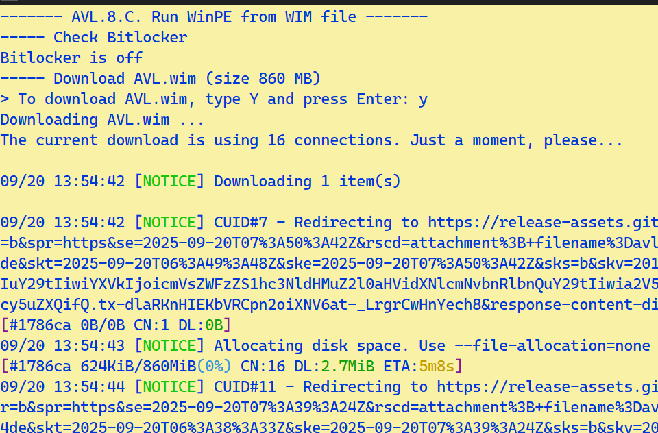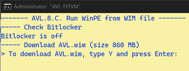 - Nhập Y nhấn Enter để ứng dụng tiến hành tự tải WinPE có dạng tập tin AVL.wim, dung lượng khoảng 860 MB.