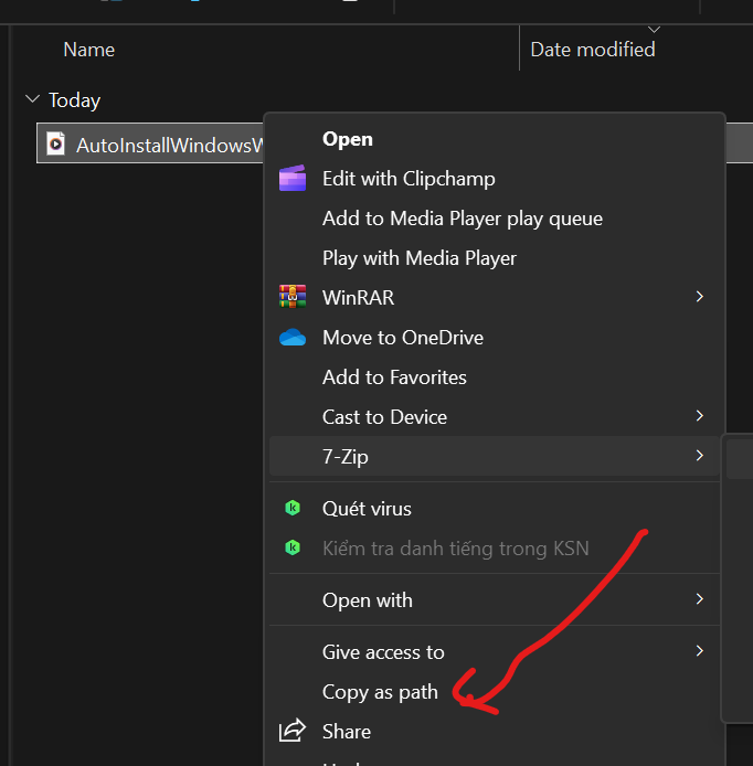 - Người dùng click phải vào tập tin ISO-WIM-ESD, chọn Copy as path. Rồi gán (paste) vào chỗ nhập này. Người dùng có thể nhập dấu ngoặc kép “…” hoặc không có dấu ngoặc kép đều được.