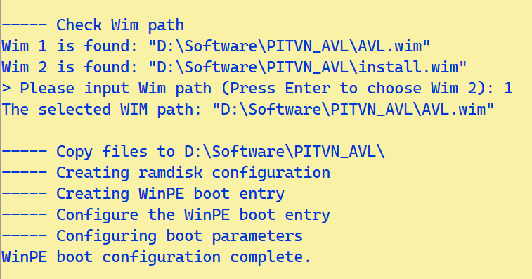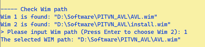 - Ở đây chúng ta cần chạy AVL.wim nên chọn 1. Có thể nhập thẳng đường dẫn vào “D:\Software\PITVN_AVL\AVL.wim”