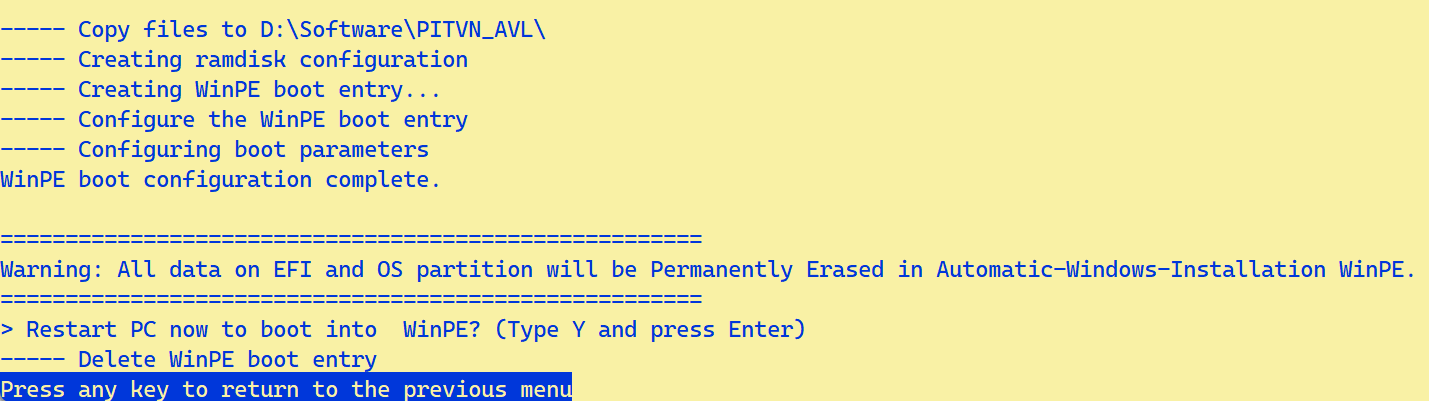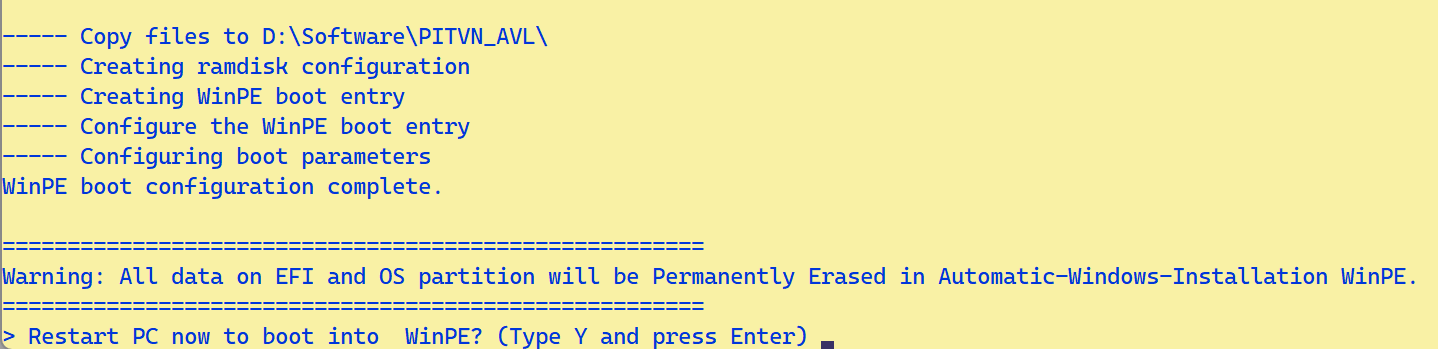 - Lựa chọn “> Restart PC now to boot into WinPE? (Type Y and press Enter):” cho biết nhấn y rồi nhấn Enter sẽ tiến hành khởi động vào AVL.wim (hoặc tập tin wim khác đã chọn). Nhập bất kỳ nội dung gì khác (không phải y) và hoặc chỉ nhấn enter sẽ gỡ bỏ Cấu trúc khởi động vào WinPE.