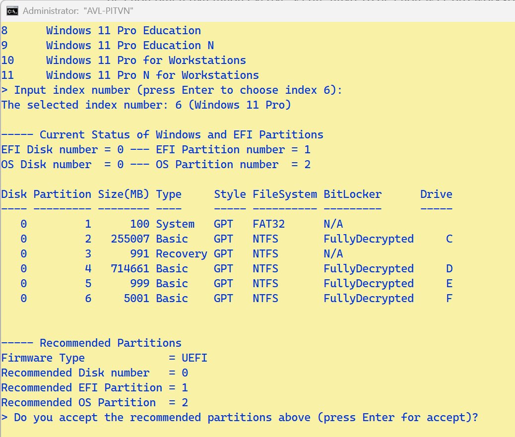 - Không nhập mà nhấn Enter sẽ tự chọn mặc định theo gợi ý trong dấu ngoặc đơn. Ví dụ: Nhấn Enter để chọn bản W11 Pro (có số chỉ mục là 6).